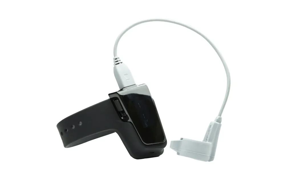 A wearable wrist oximeter with fingertip sensor, designed for comfortable overnight monitoring. The O2 MAX records continuous oxygen saturation and heart rate, providing clear, reliable data to support home sleep studies and clinical assessments.