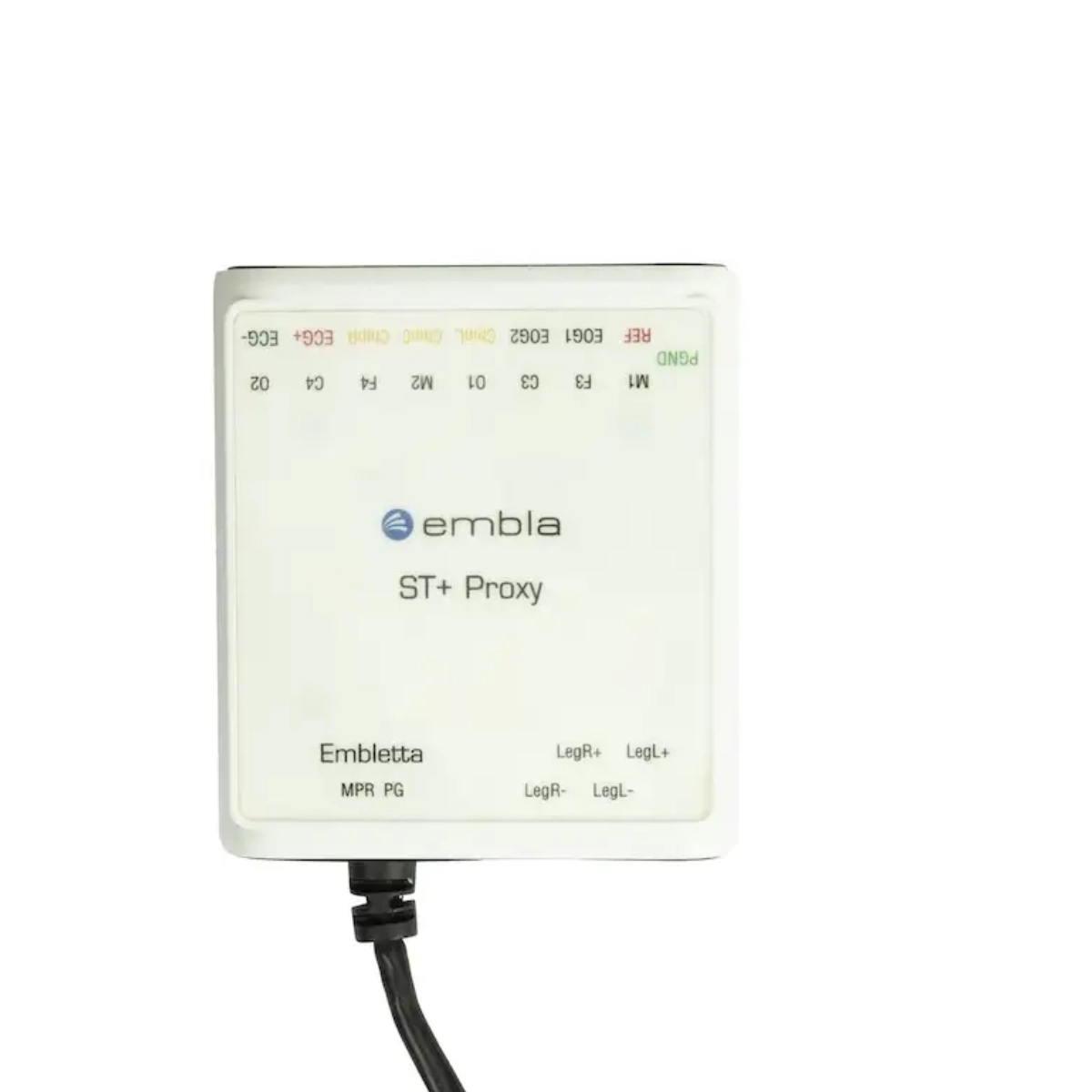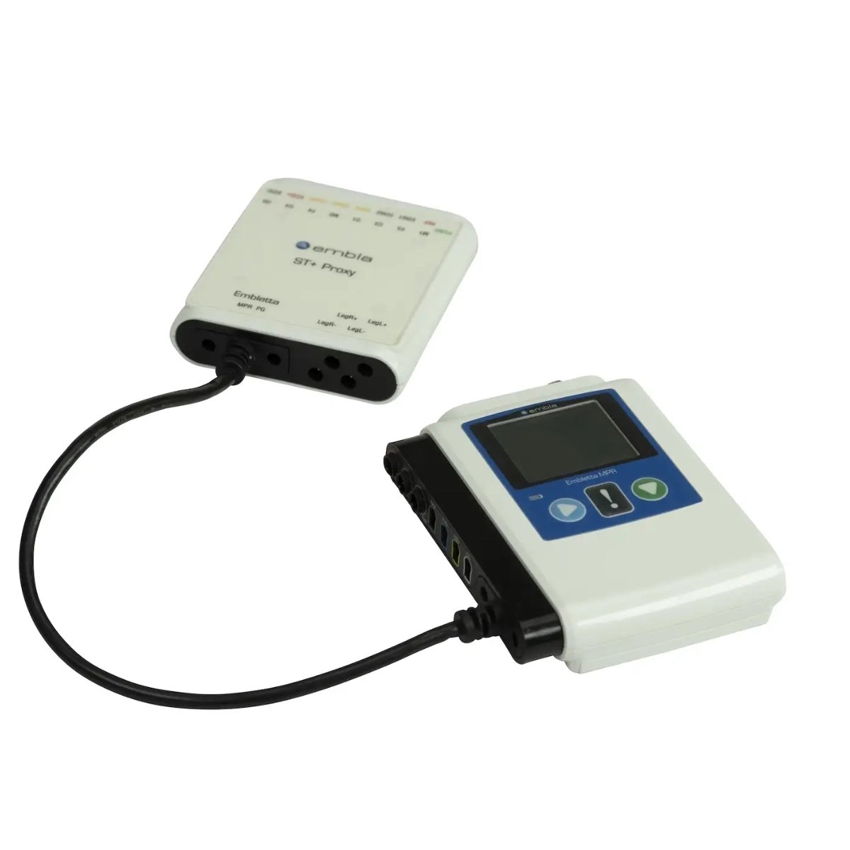 When paired with the ST+ proxy, the Embletta MPR PG is transformed into a fully functional PSG system, offering up to 65 channels of data, including EEG, EOG, EMG, ECG, limb movements, and derived channels. The ST+ Proxy enables this expanded functionality with minimal cabling and high efficiency, maintaining compliance with AASM guidelines.